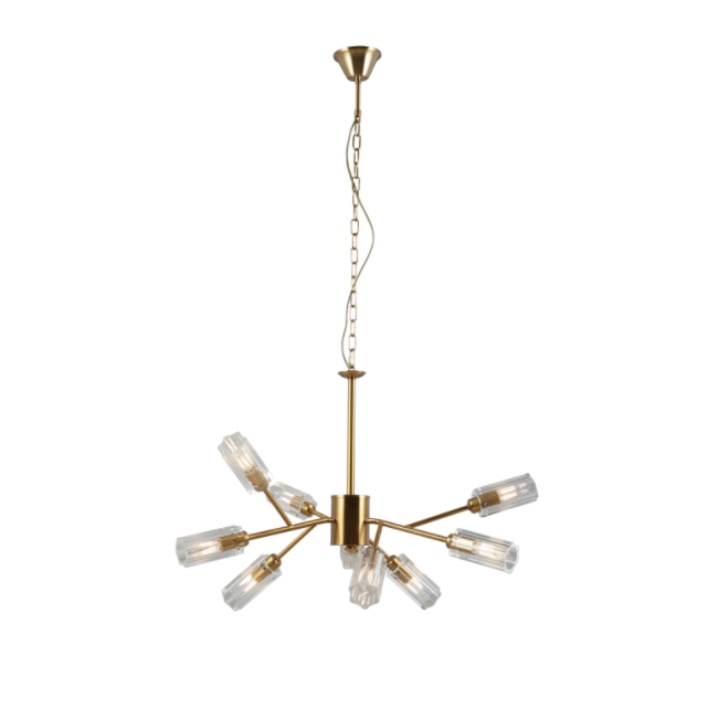 Soilsiú láidir 9-soilse Gloine Gloine Chandelier Óir: Socraítear na 9 mbolgán 9 E14 i gcruth brainse gathacha. Trí ríomh uillinne beacht, baineann sé le soilsiú 360 ° gan bhac le meán-soilsiú 300lux, ag freastal ar riachtanais soilsithe tráchtála agus baile 12-20㎡ spásanna.