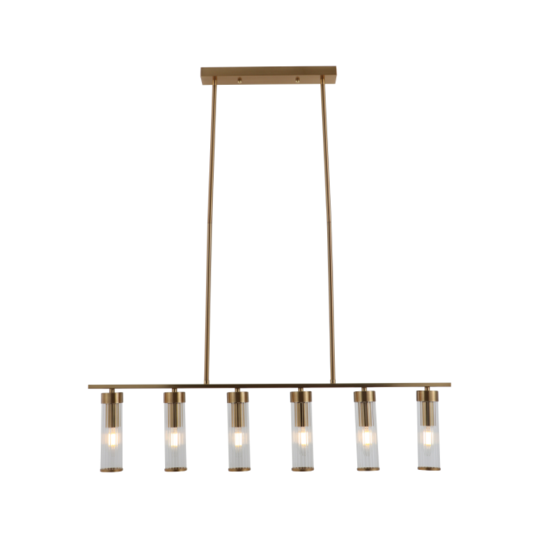 Is é atá i gceist leis an solas mórdhíola seo ná 6 soicéid bolgáin E14, a leanann le fealsúnacht dearaidh an bhranda maidir le "ealaín chumasc agus praiticiúlacht" a leanann ar aghaidh le solas an phraghas mórdhíola seo. Faigheann na feadáin ghloine stríocacha atá cruthúnas ar an solas soiléir cóireáil neartaithe ardteochta, ag tairiscint tarchurtha solais ard agus frithsheasmhacht in aghaidh tionchair agus teochtaí arda. Tá tástáil spraeála salainn 48 uair an chloig caite ag fráma crua-earraí pendant líneach gloine inchoigeartaithe CE agus OL, ag cinntiú go bhfuil luster buan i dtimpeallachtaí tais agus ag cuimsiú stíl nua-aimseartha só-nua-aimseartha.