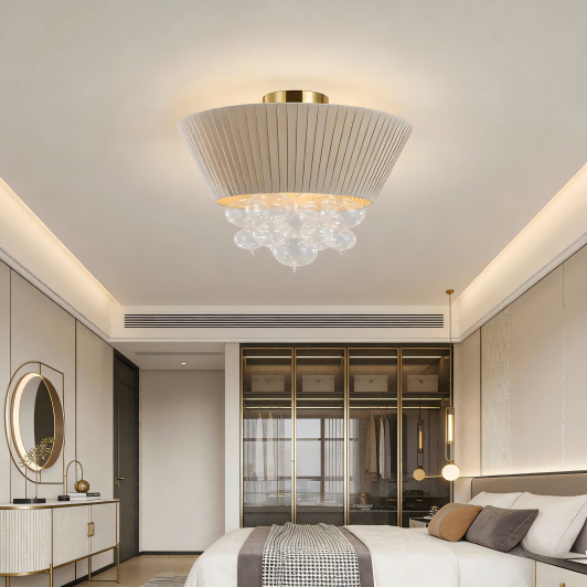 Le linn a sheirbhís fhadtéarmach i margaí na hEorpa agus Mheiriceá, thug Strong Lighting aird i gcónaí ar riachtanais aeistéitiúla agus cásanna úsáide úsáideoirí deiridh. Déantar scáth lampa fabraic an lampa uasteorainn seo le teicnící uigeachta brúite láimhe, rud a chruthaíonn uigeacht pleated nádúrtha agus tríthoiseach. Tá an solas a astaíonn sé bog agus scaipthe go cothrom, rud a chruthaíonn timpeallacht soilsithe te agus compordach. Séidtear na boilgeoga gloine atá ar crochadh thíos, agus cruth beagán difriúil ar gach ceann acu. Nuair a bhíonn siad soilsithe, is cosúil le coirníní solais ar fionraí, rud a chuireann éifeacht solais agus scáth dinimiciúil agus a fheictear i láthair. Cibé an bhfuil sé in úsáid i spás cónaithe íostach Nordach nó in áit tráchtála le stíl só éadrom, féadann sé cáilíocht an spáis a fheabhsú go suntasach.