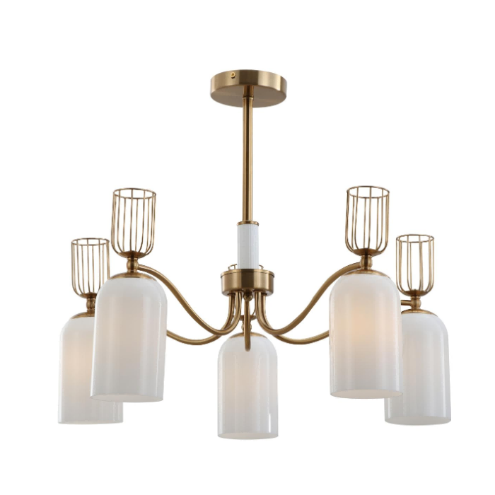 5 Domes Gloine Opal: Bainne Retro 5-Light Gloine Bán Gloine Bán Candelier Bán-Bán-Bán Gloine Opal Gloine Diffes Solas síos, ag cruthú linnte te solais gan uasteorainneacha ísle.